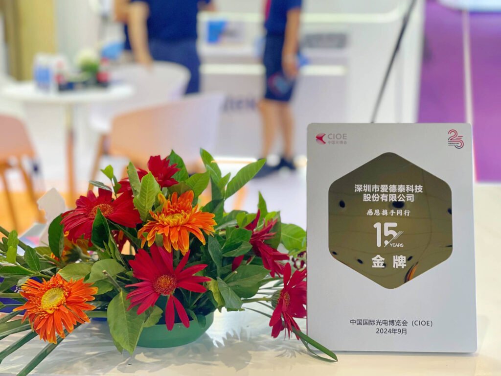 爱德泰作为行业重要参展企业代表,参加了CIOE二十五周年庆典暨CIOE 2024开幕欢迎晚会,更是荣获了25周年庆“优秀战略合作伙伴”金牌。