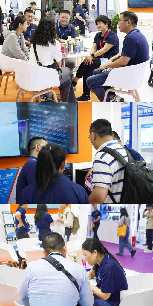 展会期间,爱德泰展台热闹非凡,展位以橙色为基调,融合光纤跳线元素,新颖的设计吸引了众多客户和观众驻足参观。我们通过生动的现场演示和互动体验,让每一位参观者都能直观感受到产品的技术魅力和应用价值。