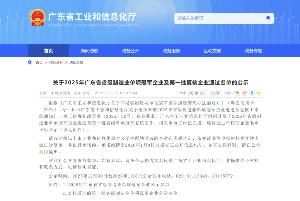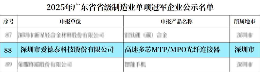 2025年12月31日,广东省工业和信息化厅正式公示了2025年省级制造业单项冠军企业名单,爱德泰凭借产品“高速多芯MTP®/MPO光纤连接器”的技术赋能与市场优势跻身其中。此次入选,不仅是对爱德泰技术硬实力的认可,更是对爱德泰赋能“广东智造”、助力区域制造升级核心贡献的高度肯定,同时也为公司2026年持续高质量发展注入强劲动力。