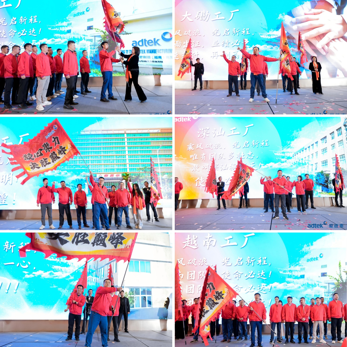 随后,五大战区——大磡工厂、光明工厂、深汕工厂、江苏泗洪工厂、越南厂区的负责人依次率领核心团队上台,郑重从总经理手中接过战旗。各战区负责人挥动战旗,带领团队发出铿锵有力的誓言。“乘风破浪,光启新程”的年度主题,更作为共同的信念,在每一面挥舞的旗帜下反复响彻。鼓声雷动,战旗飞扬,这不仅是一场仪式,更是全体爱德泰人承接使命、齐心共赴未来的昂扬号角。