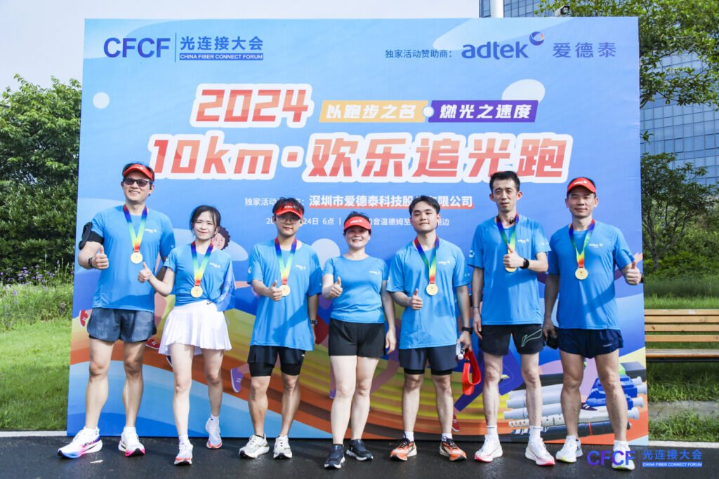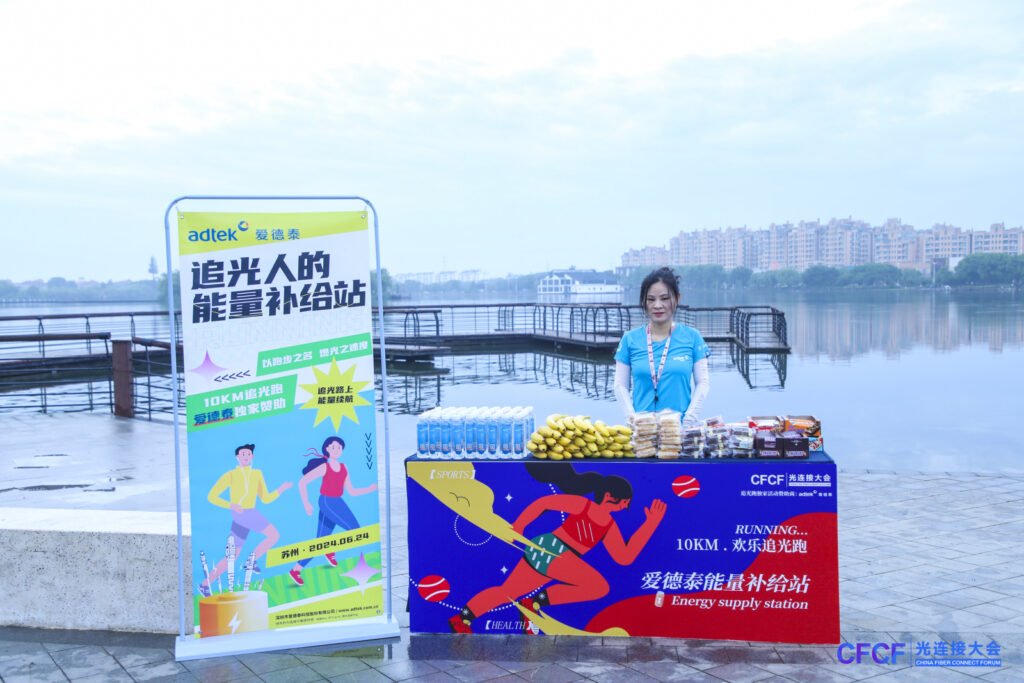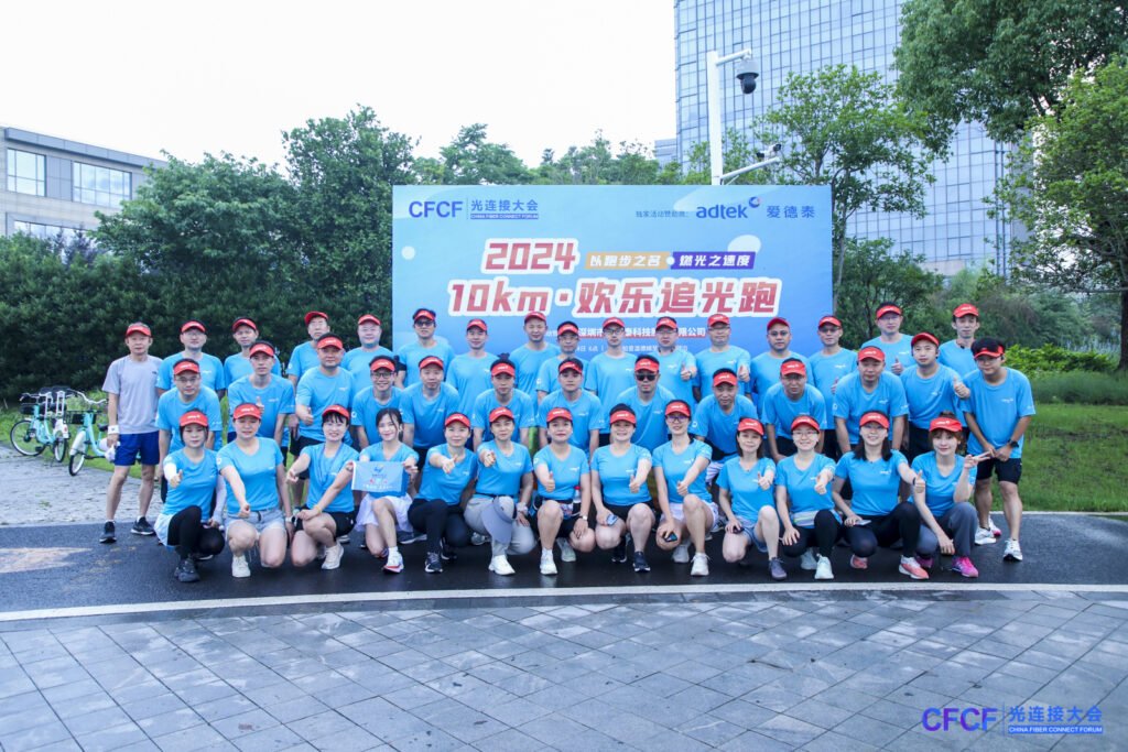 此外,爱德泰还是本次“追光跑”活动的独家赞助商。6月24日清晨,“10KM·欢乐追光跑”活动在汾湖畔跑道上如期顺利开展,来自全球的光通信行业精英们齐聚一堂。爱德泰特别为参与者们定制了舒适的防晒帽和跑服,在奔跑中鲜艳的红蓝配色成为了汾湖畔的一抹亮丽的风景。