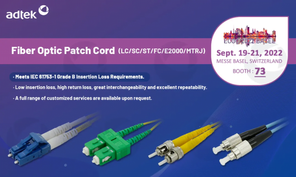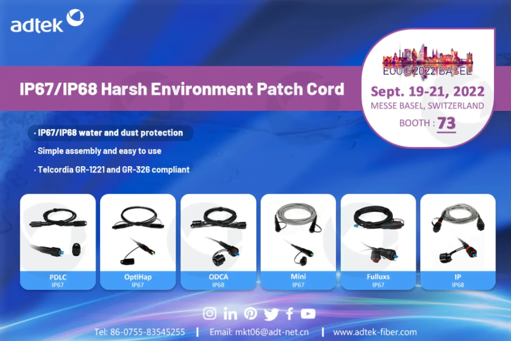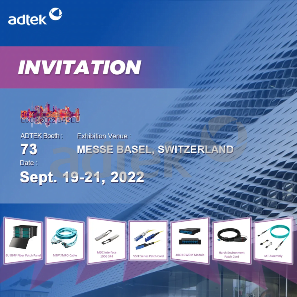 欧洲光纤通讯展览会(ECOC)是欧洲规模最大的光纤通讯展会,在光通讯行业拥有极大的影响力。ECOC将于2022年9月19日-21日在瑞士巴塞尔展览中心举行。深圳市爱德泰科技有限公司(ADTEK)将携VSFF跳线、Grade B常规跳线、1U432F MDC配线架、IP67/IP68 防水跳线等产品及解决方案在欧洲与大家见面,我们诚挚地邀请您参与盛会,莅临爱德泰#73展台参观指导!