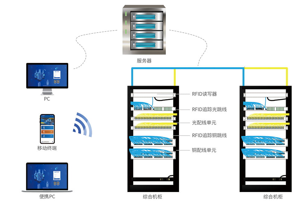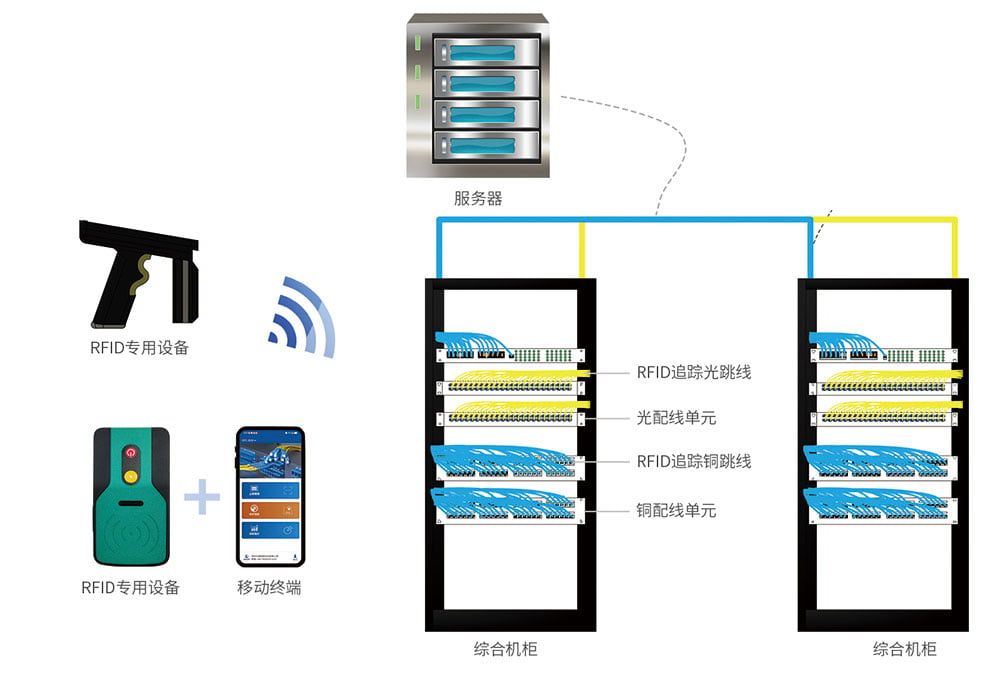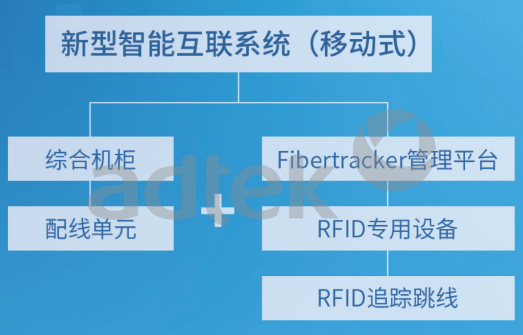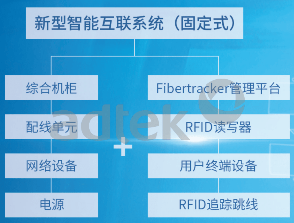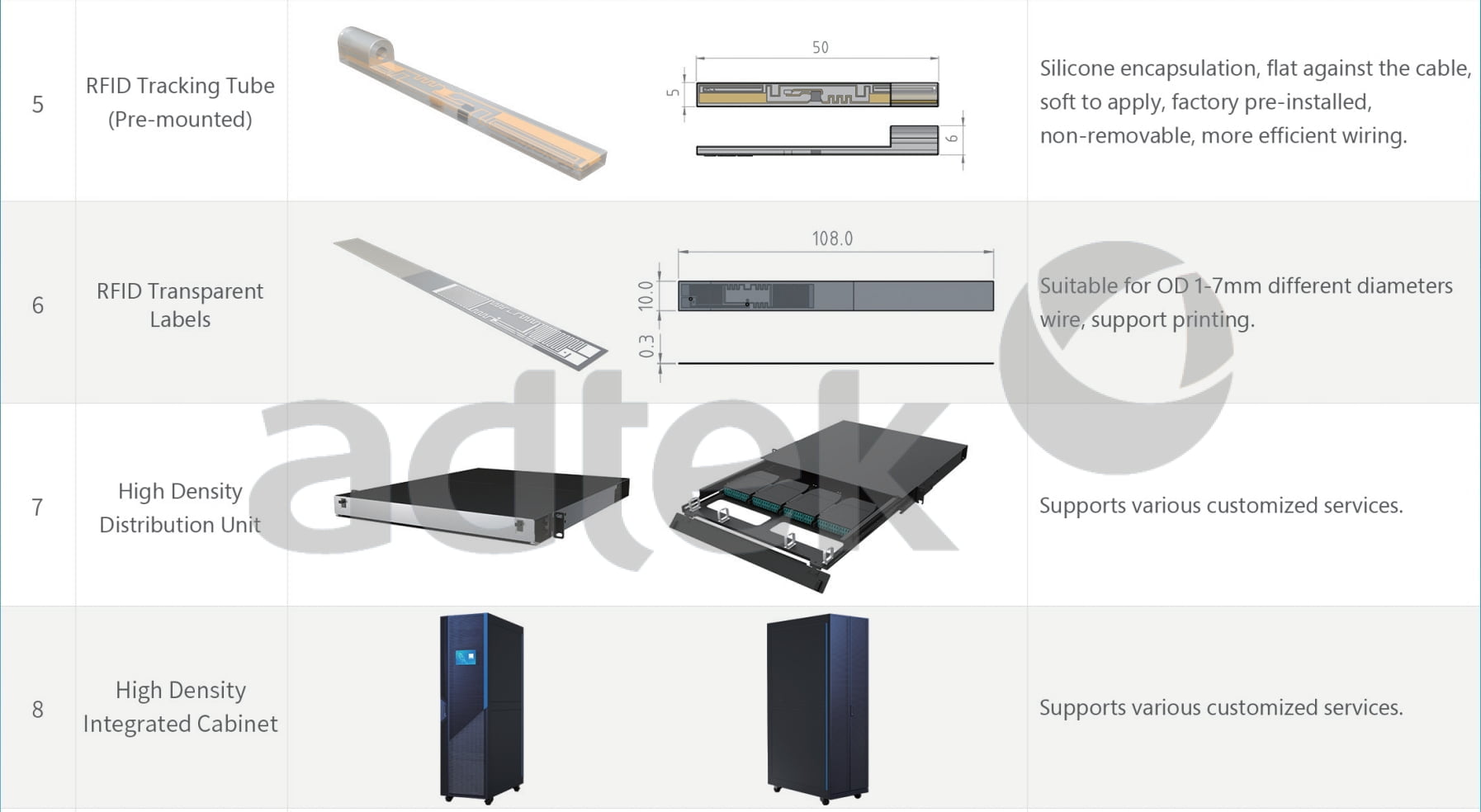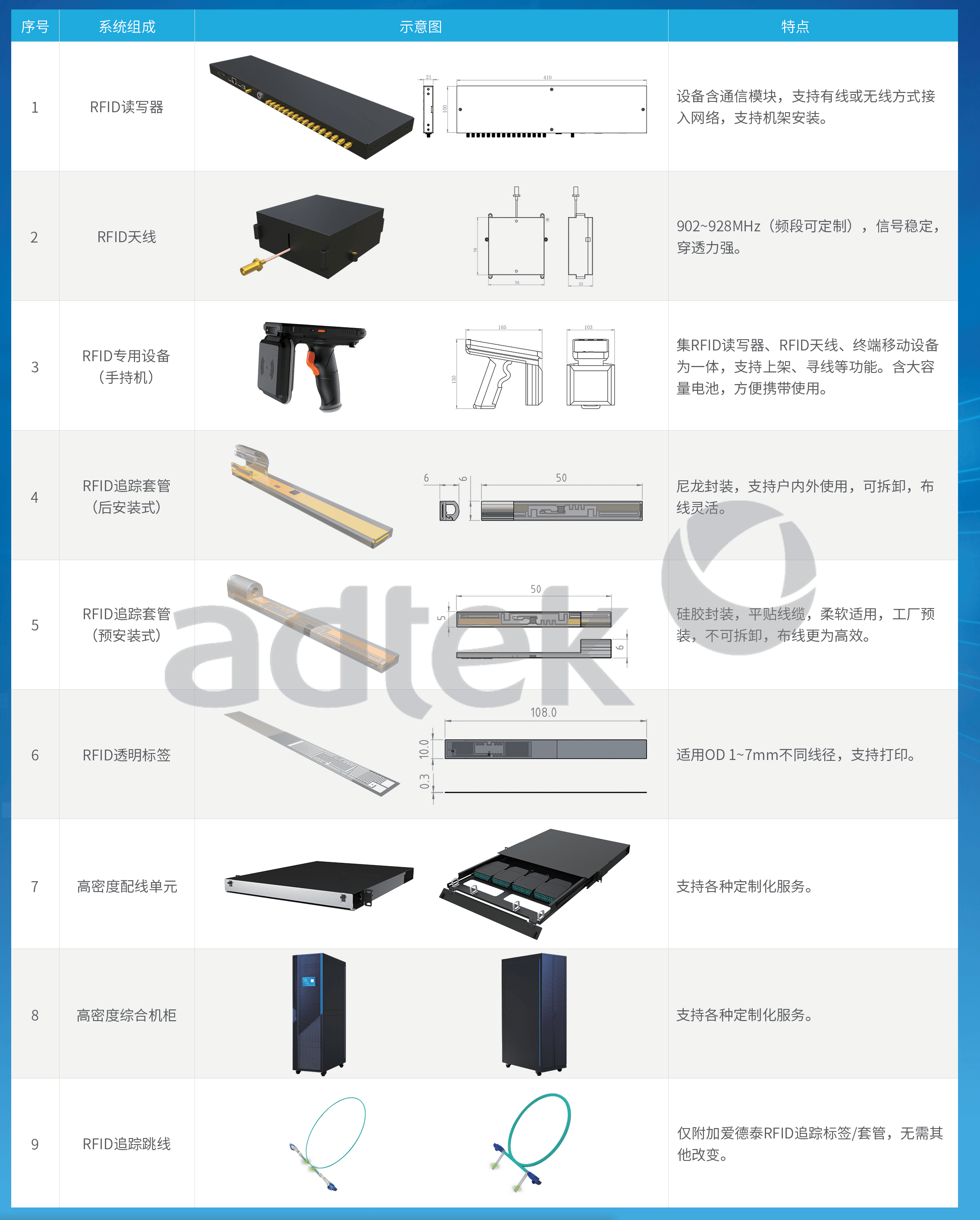 爱德泰提供新型智能互联系统,包括RFID追踪标签/套管、各类跳线、RFID读写器、RFID专用设备、高密度配线单元、高密度综合机柜、光适配器、铜模块等。