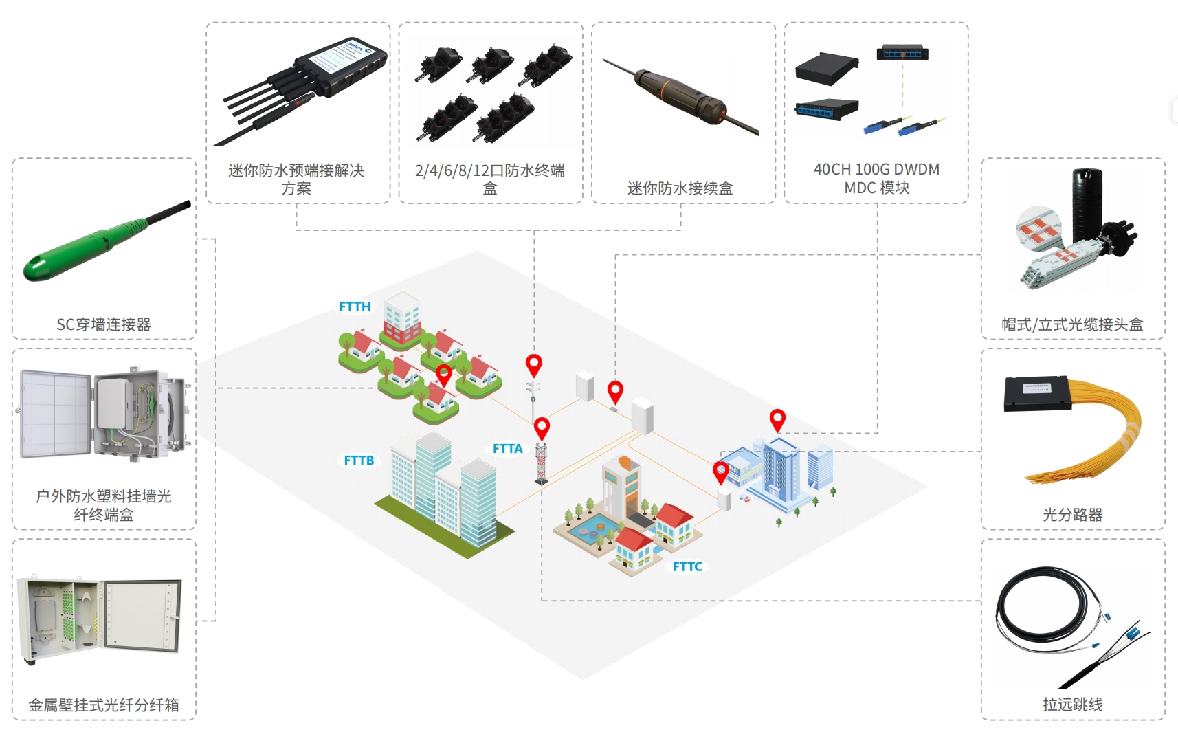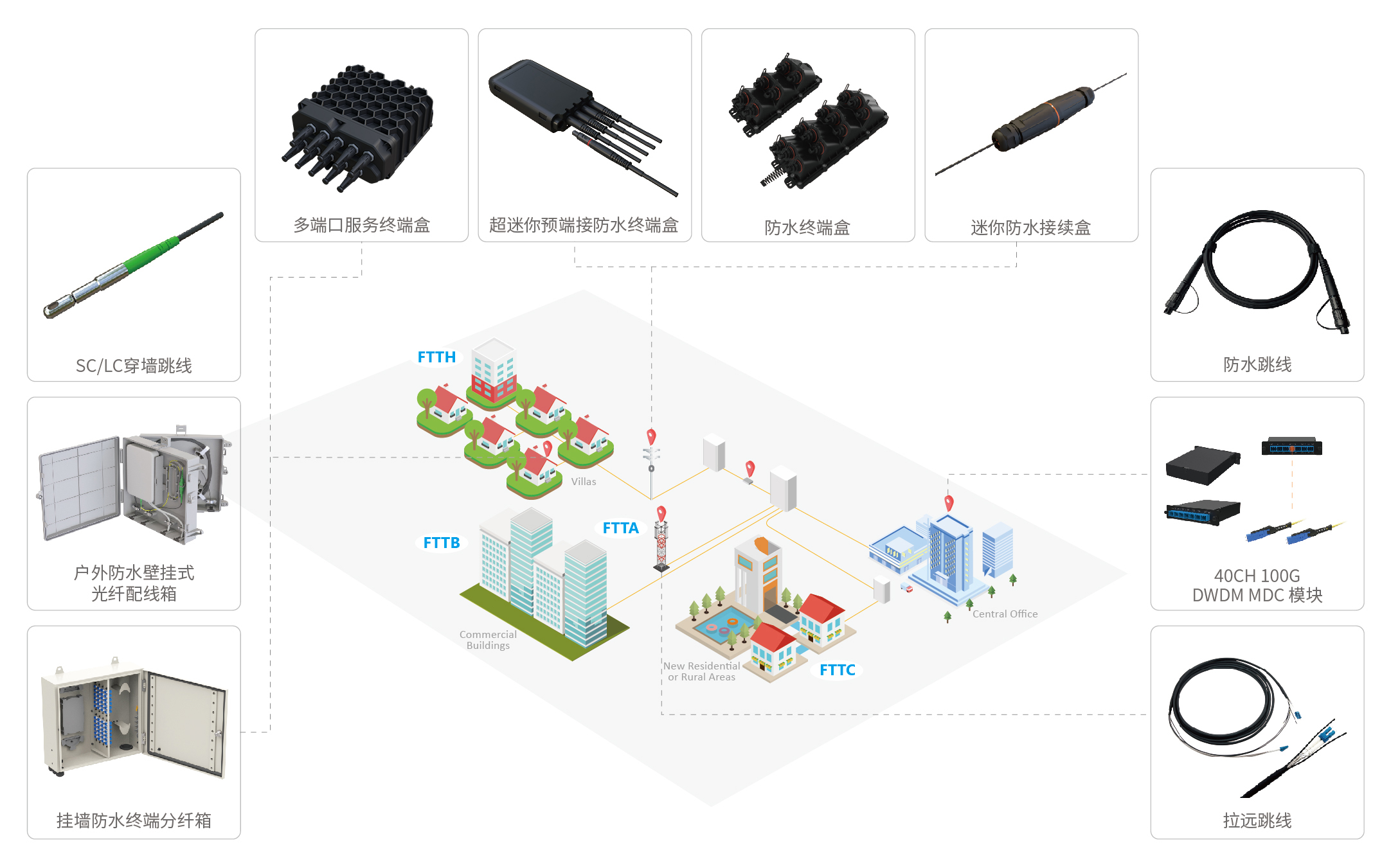 爱德泰提供从中心局到用户侧全套ODN与无源光网络连接解决方案,包括光缆终端盒、分纤箱、接续盒、防水跳线、拉远跳线、穿墙跳线、PLC分光器等,适用于FTTH、FTTB、FTTR、5G前传和承载网络。产品具备IP65/IP68防护等级、即插即用安装方式、工厂预端接设计,显著提升网络部署效率与可靠性,是构建高密度接入和高稳定性5G光纤基础设施的理想选择。