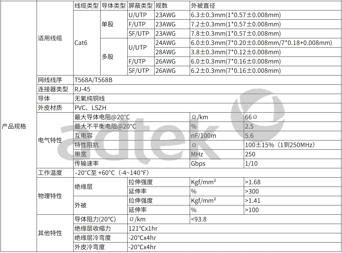 爱德泰ADTEK提供的Cat6 网络跳线采用PVC/LSZH外护套,支持即插即用,使用方便且灵活。所有成品跳线均严格依据ISO/IEC 11801和EIA/TIA 568-B.2-D的标准进行测试,确保了传输系统的高可靠性。